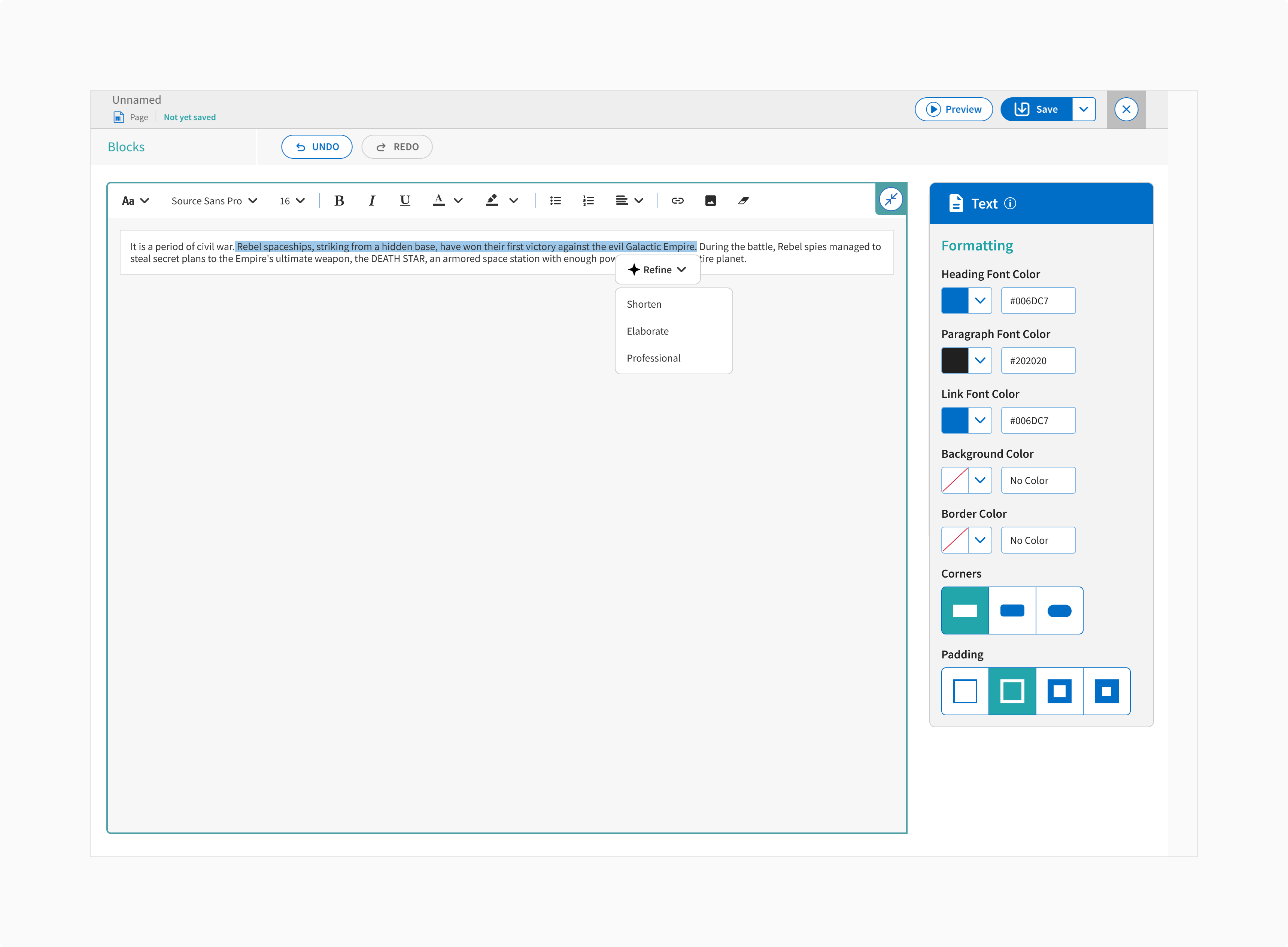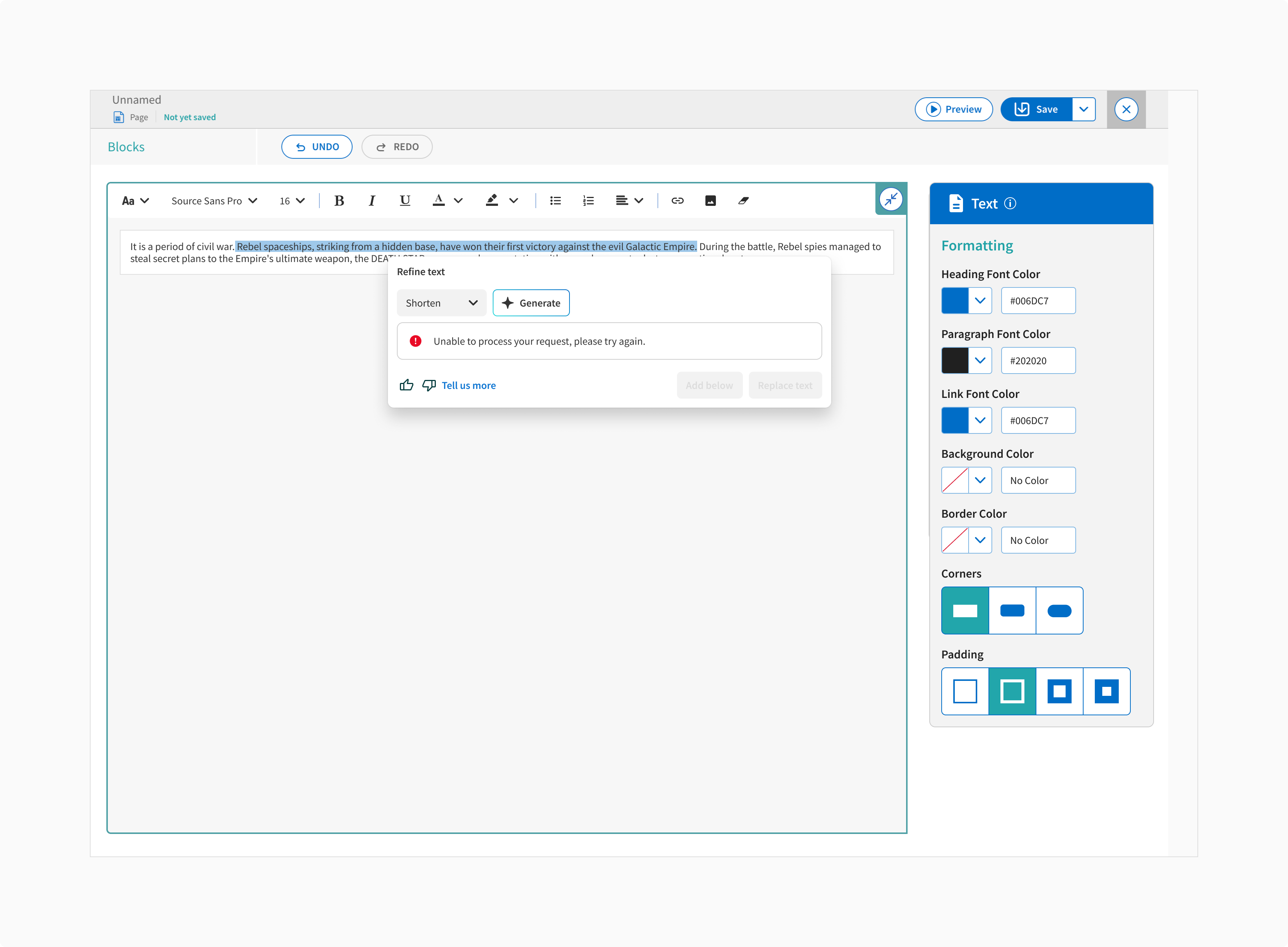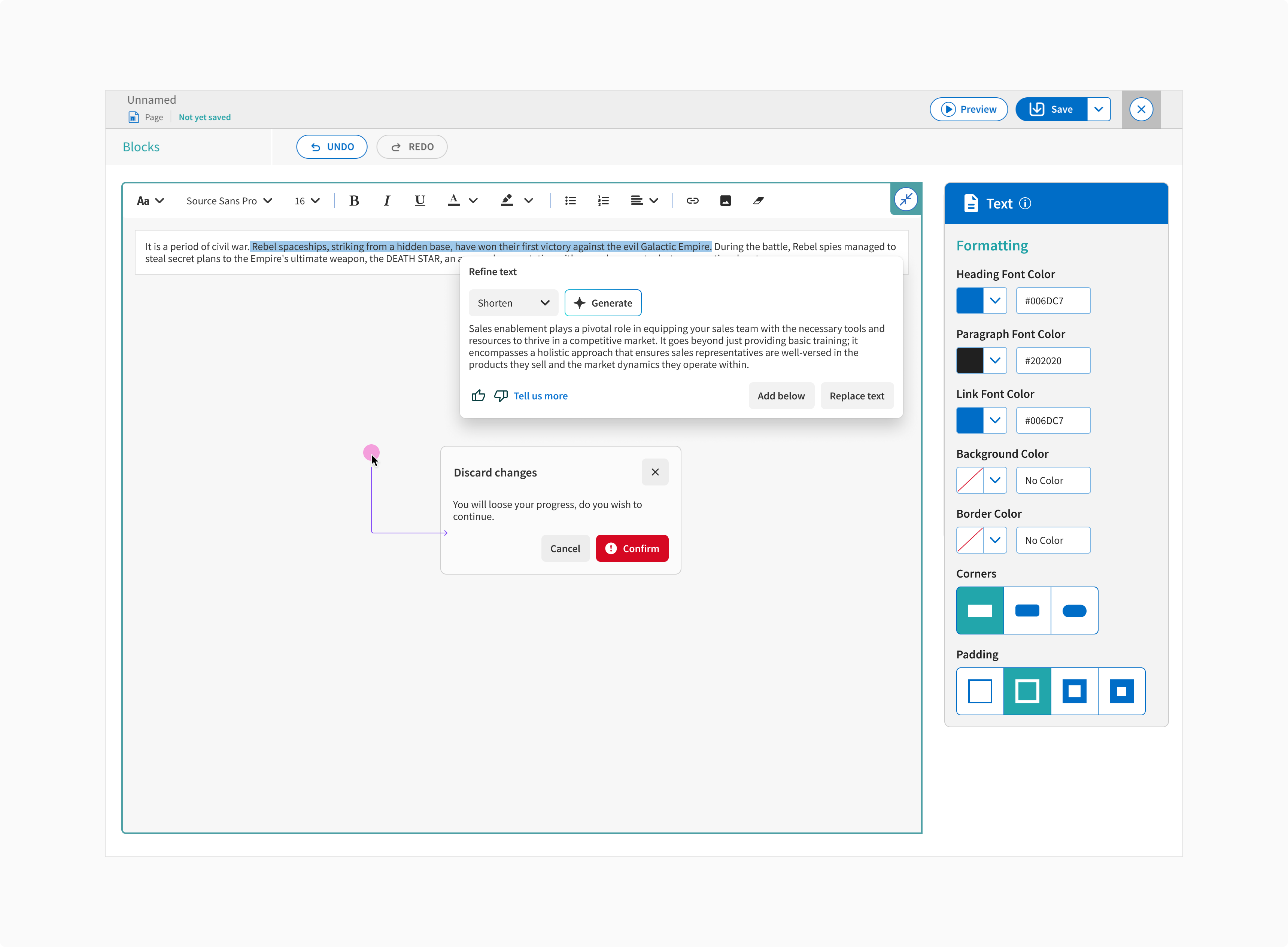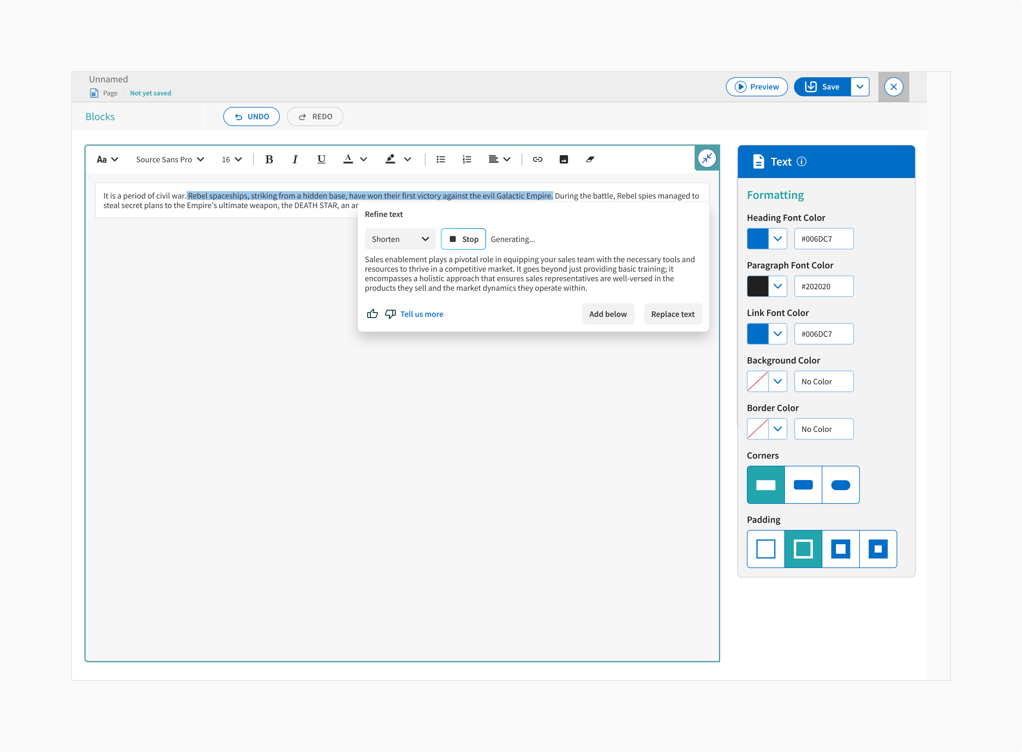 Highspot’s exploration into AI text generation had remained in an alpha state while the platform underwent a major transition to a new text editor. Once the migration was complete, we faced a market where Generative AI was commonplace, yet our internal authoring experience remained manual and fragmented.